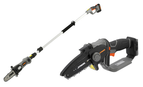 STHOR akkumlátoros magassági ágvágó 20 V (akku + töltő) + STHOR akkus láncfűrész 150 mm 20 V (akku + töltő nélkül)