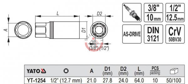 YATO YT-1254 Gyertyakulcs 1/2" 21mm