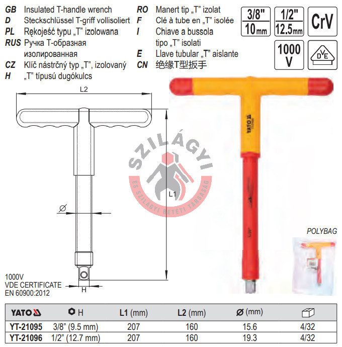YATO YT-21095 Szigetelt T hajtókar 3/8" 200mm