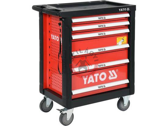 Szervizszekrény YATO szerszámokkal. 6 fiókkal rendelkezik zárral, amelyek golyóscsapágyra vannak felszerelve - 3 felső polc 25 kg-os teherbírású és 3 alsó polc 35 kg-os. A szekrény praktikus fogantyúval és tartós gumikerekekkel van felszerelve, így a mozgatás nem probléma. A munkafelületet csúszásmentes anyaggal borították, ami megkönnyíti a szekrényen végzett munkát. Az erős, dupla falak és a sárvédőkkel ellátott sarkok miatt a szekrény tartós.