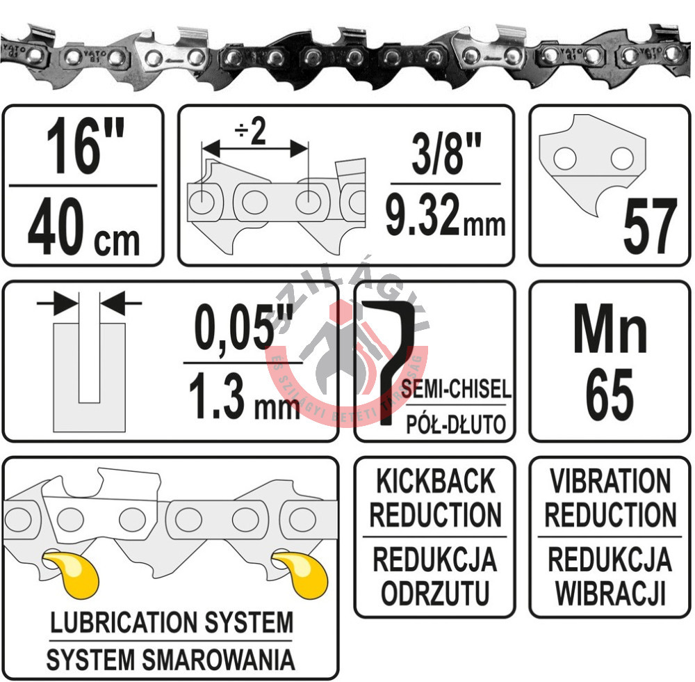 Vágólánc benzines és elektromos láncfűrészekhez. Hossz 16", 57 láncszem, 3/8" osztás, szélesség 0,05" (1,3 mm). Fél véső típusú vágófog nagy vágási sebességgel. Tiszta és mérsékelten szennyezett fa vágására tervezték. Mn65 mangánacélból készül, amely megnövelt szakítószilárdságot biztosít, így jelentősen meghosszabbítja a lánc élettartamát.